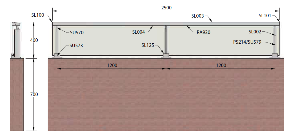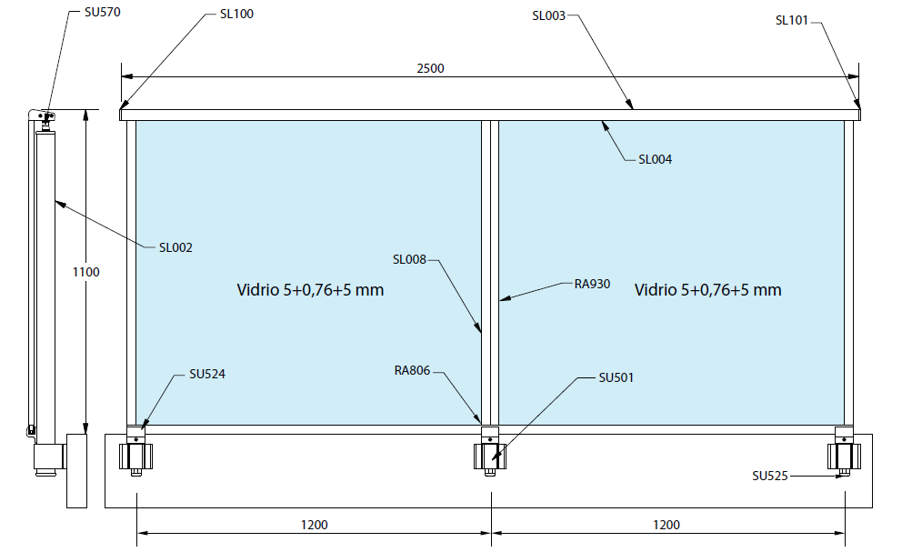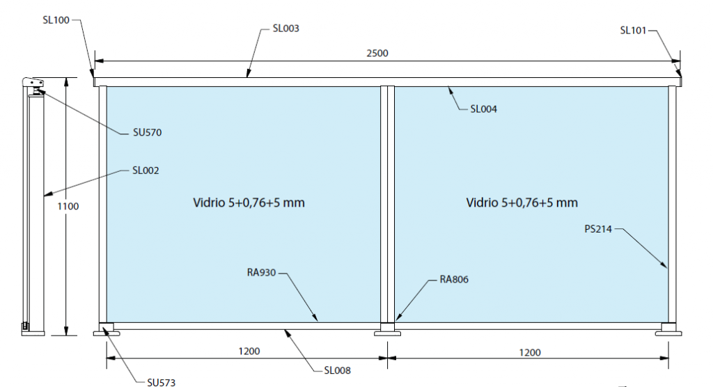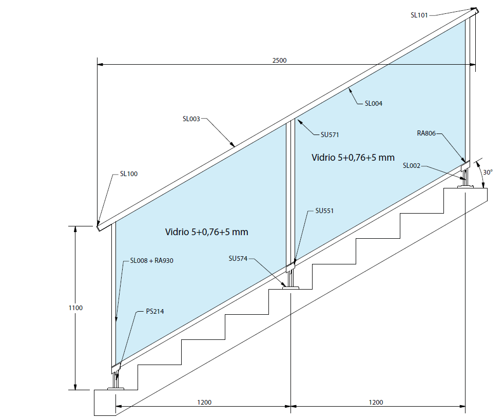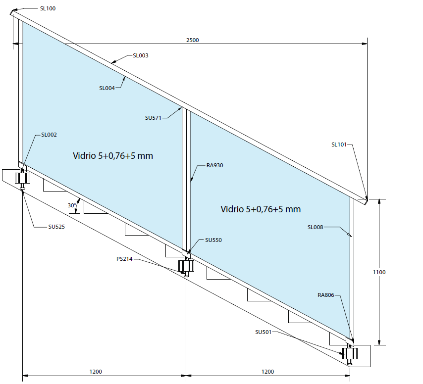 Predominancia de vidrio desde el pasamanos a 2 centímetros del suelo.